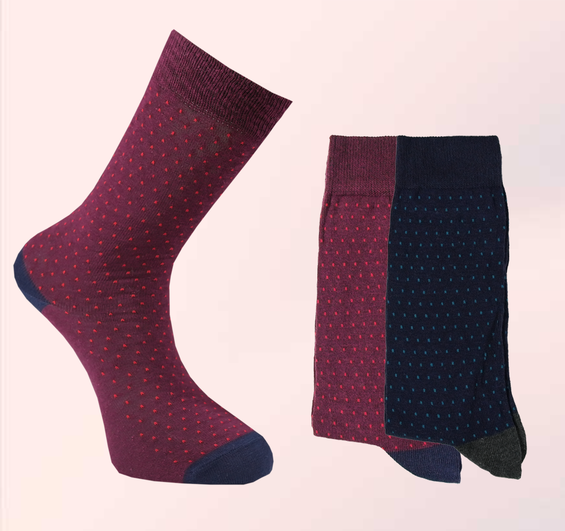 Renk: Çorapların rengi bordo ve lacivert renklerden oluşuyor. Üzerindeki desenler ise daha koyu bir bordo veya bordoya yakın kırmızı tonlarında, lacivert çorap için de turkuaz nokta renktir.Bu renk kombinasyonu, çoraba hem ciddi hem de şık bir görünüm katıyor.
