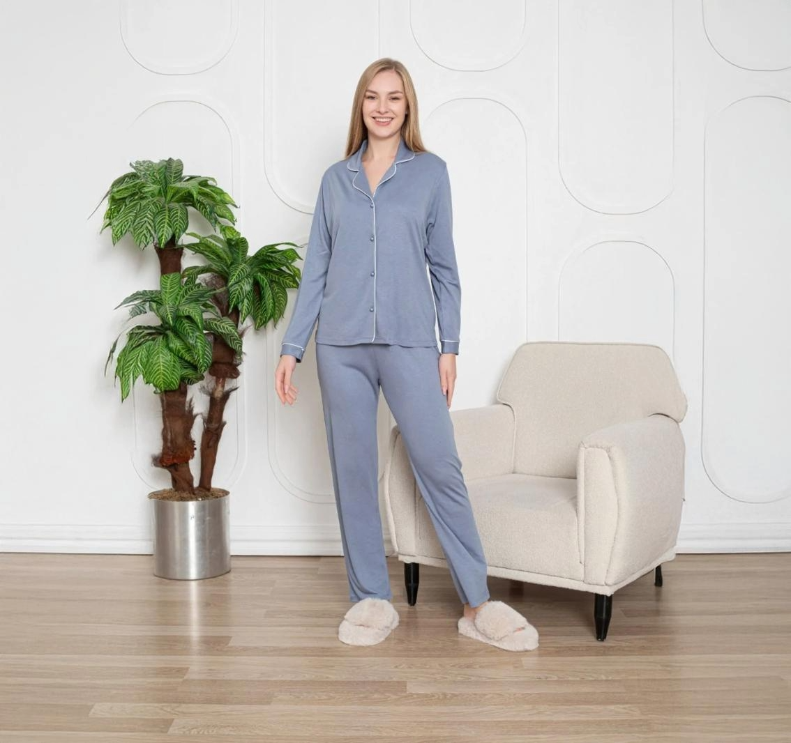 Homewear koleksiyonunun zarif bir parçası olan bu pijama takımı, her yaş grubuna hitap eden düz deseniyle sade ve şık bir görünüm sunar. Regular kalıp sayesinde rahat hareket etme özgürlüğü sağlar ve günün her saatinde konforunuzdan ödün vermezsiniz. Uzun paça boyu ve uzun kollu tasarımı ile mevsim geçişlerinde ideal sıcaklık dengesi sunarken, gömlek yaka detaylarıyla feminen çizgileri ön plana çıkarır. İki parçadan oluşan set içeriği Hem üst hem de alt giyimde şıklığı ve rahatlığı bir arada sunarak evdeki dinlenme anlarınızda vazgeçilmez bir tercih haline gelir. Normal bel kesimiyle gün boyu rahat bir kullanım imkanı tanırken, uzun boy üst ve pantolon kombinasyonu tüm gün konforunuzu artırır. Her ortama uyum sağlayacak şekilde tasarlanmış olan bu pijama takımı, evde geçirilen zamanların keyfini çıkartırken stil sahibi olmanızı sağlar.