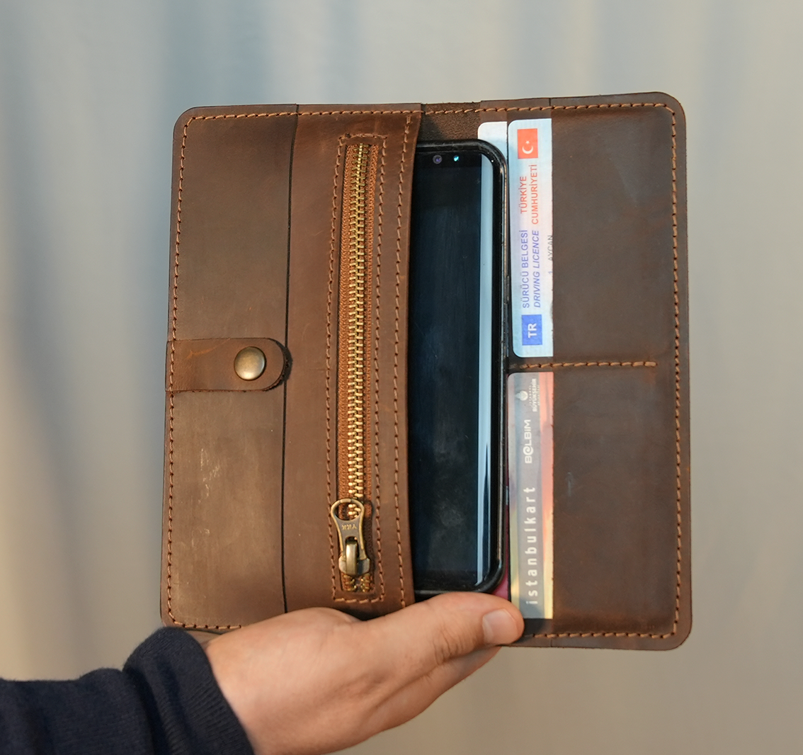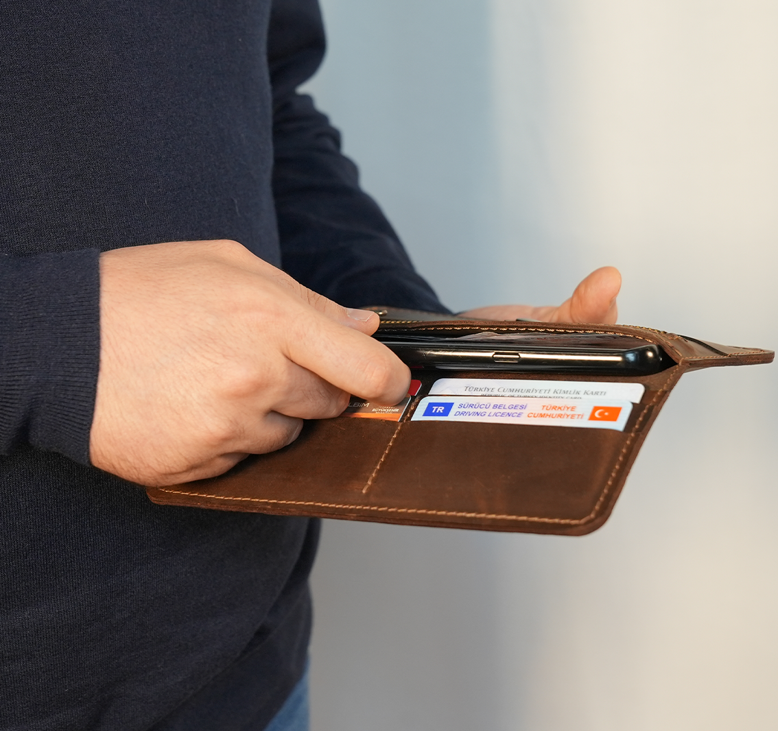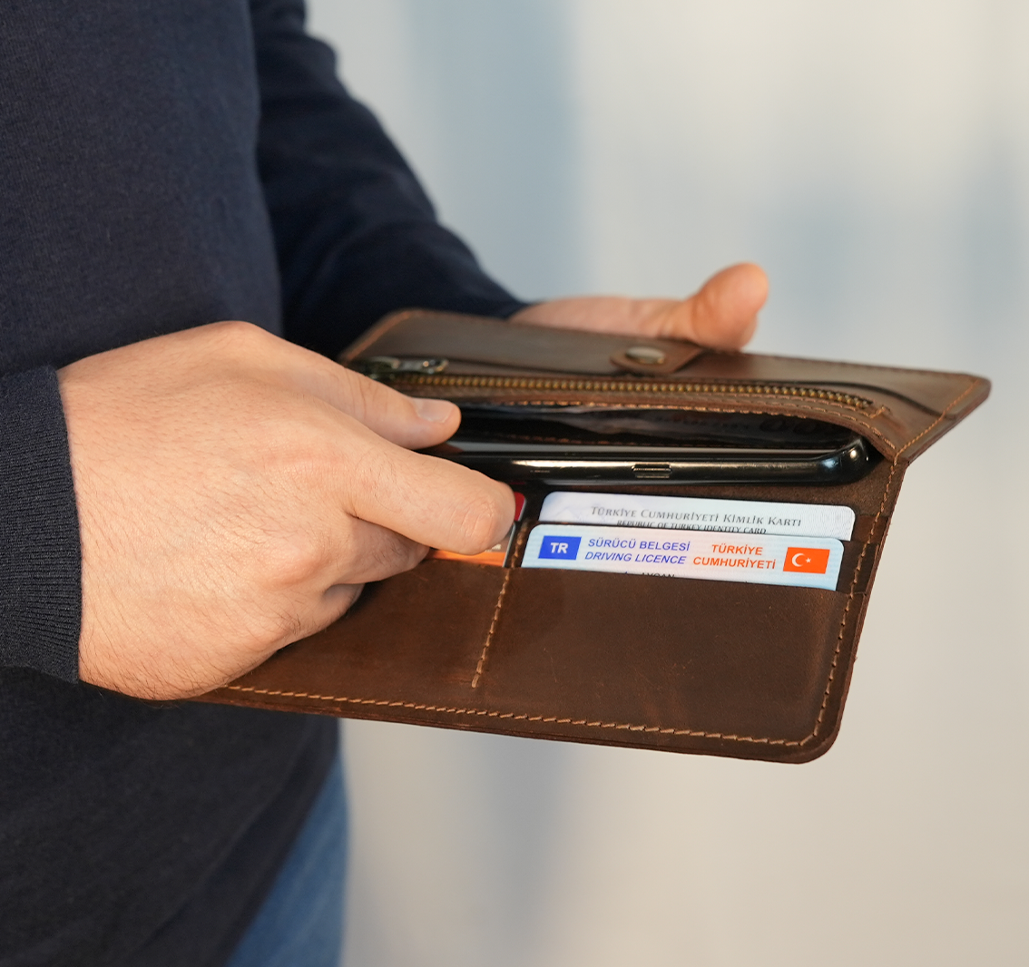Ayrıca telefon bölmesi ile telefonlarınızı rahatca muhafaza edebileceğiniz de bir alan sağlıyor. El yapımı deri cüzdan arayışında olanlar için mükemmel bir tercih. Kartlarını ve paranı güvenle taşıman için tasarlandı.