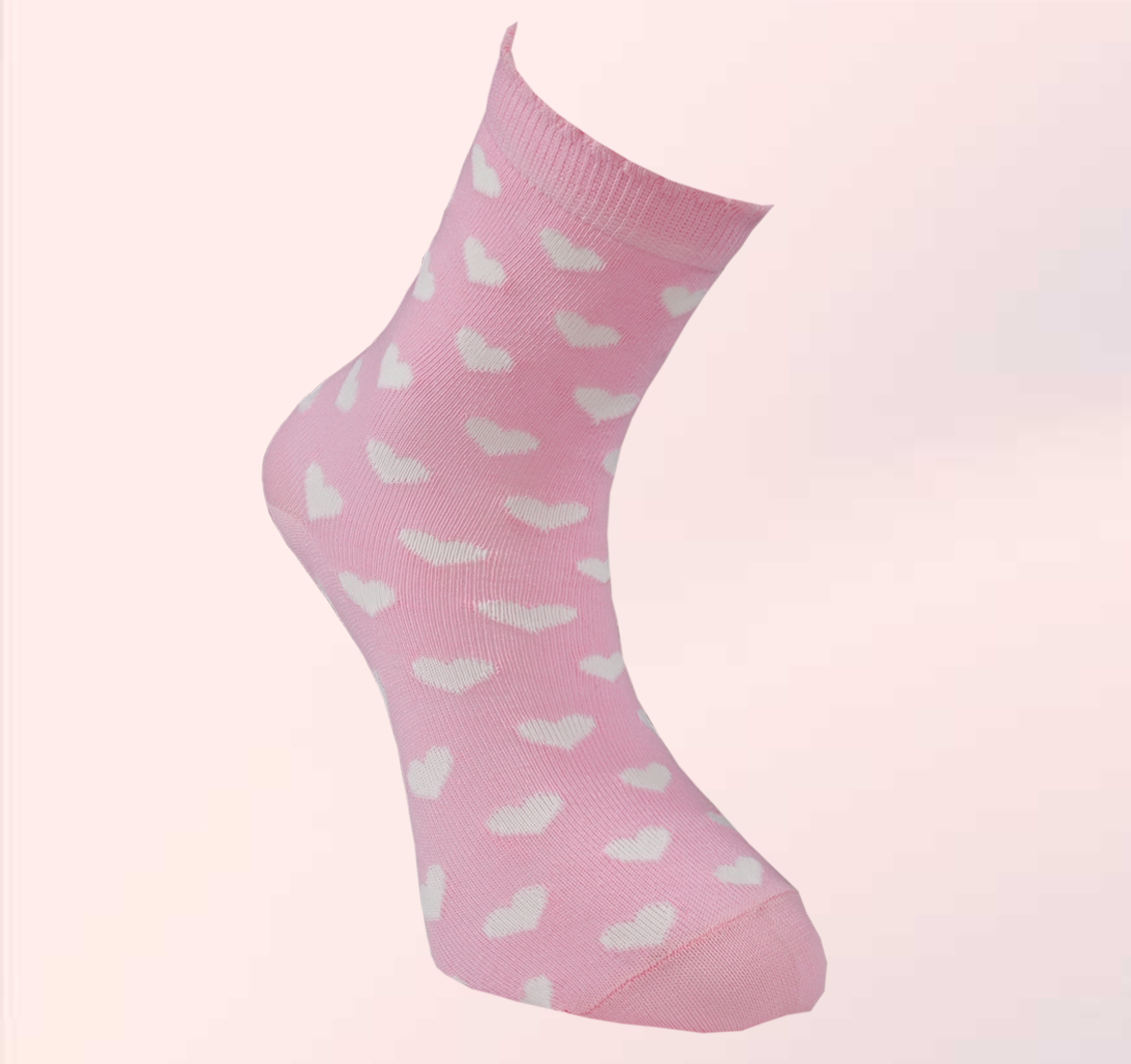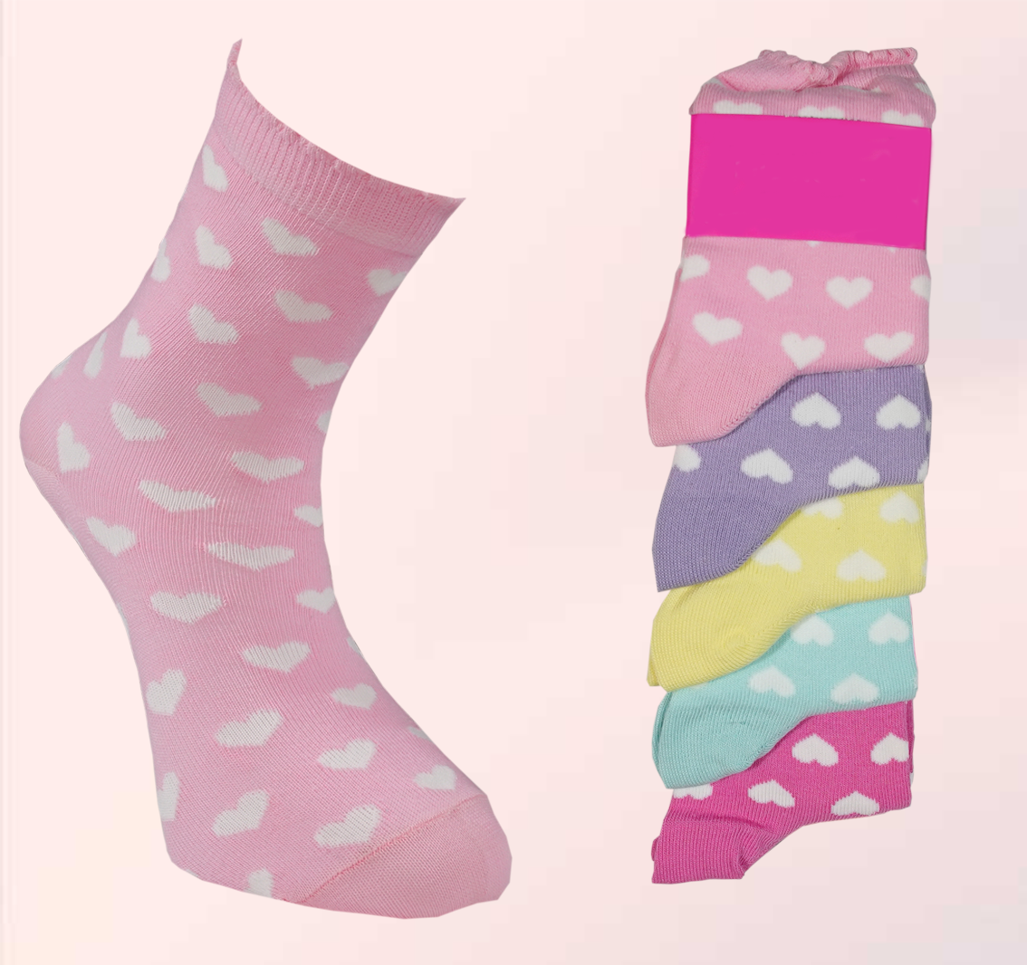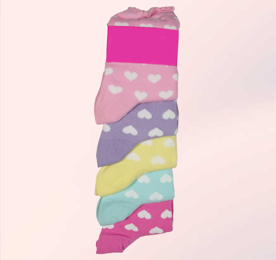 Renkler: Çoraplar, pastel tonlarda pembe, sarı, mor, mavi gibi canlı ve sevimli renklerde. Bu renklerin üzerinde beyaz kalp desenleri bulunuyor. Bu renk kombinasyonu, çoraplara hem feminen hem de genç bir hava katıyor.