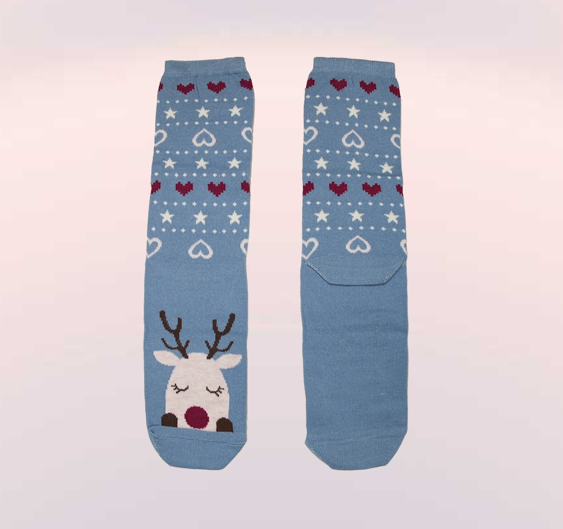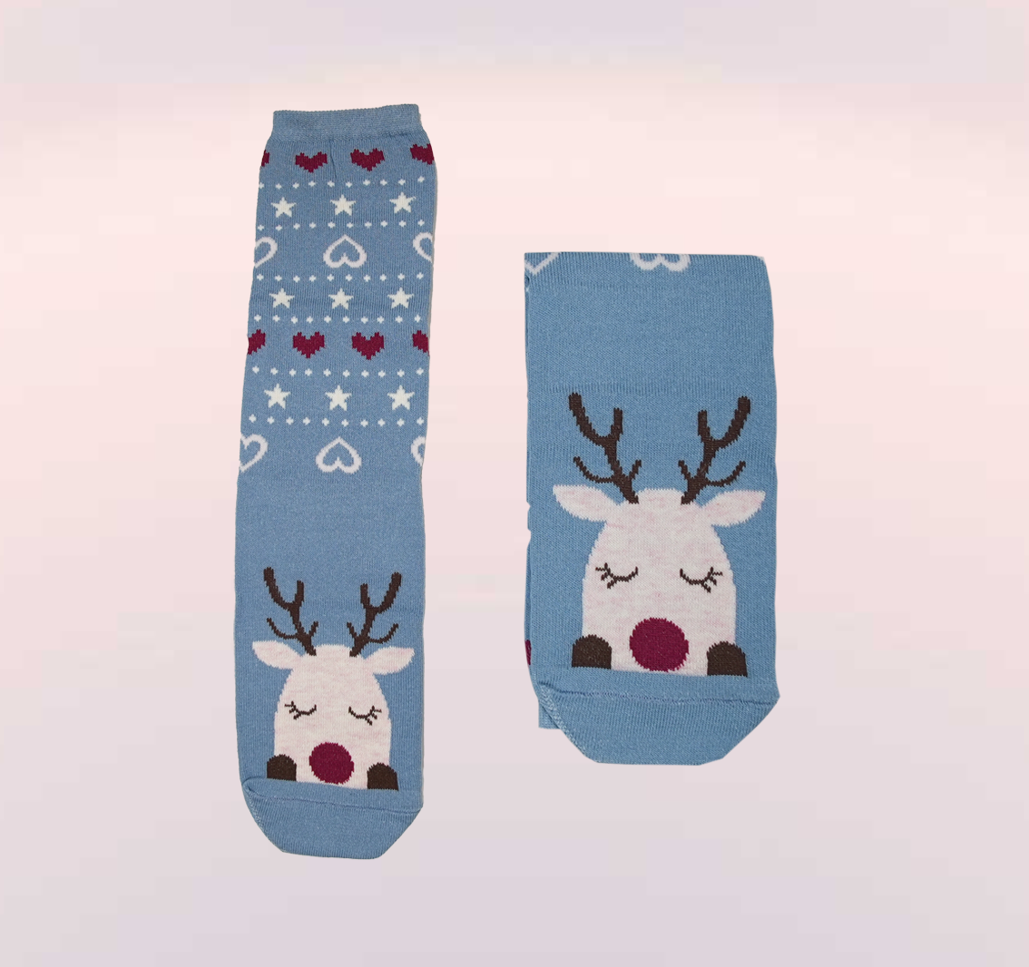 Çorap mavi renktedir ve üzerinde yılbaşı desenleri, kalpler ve geyik deseni vardır.Türü: Çorap, diz üstü değil, daha kısa bir model.... Daha Fazla Oku