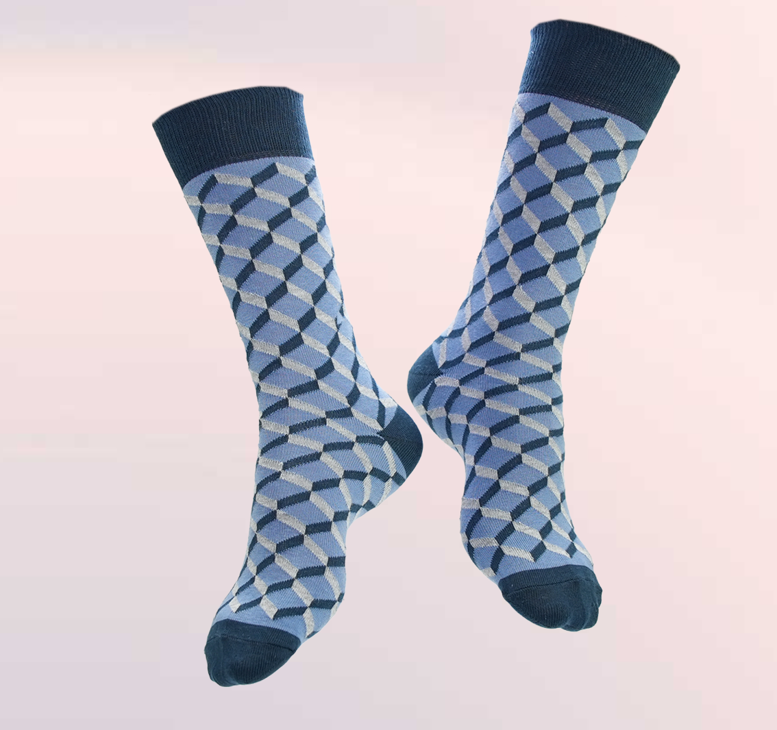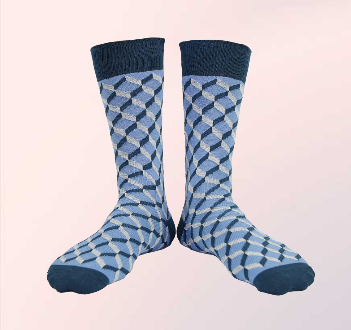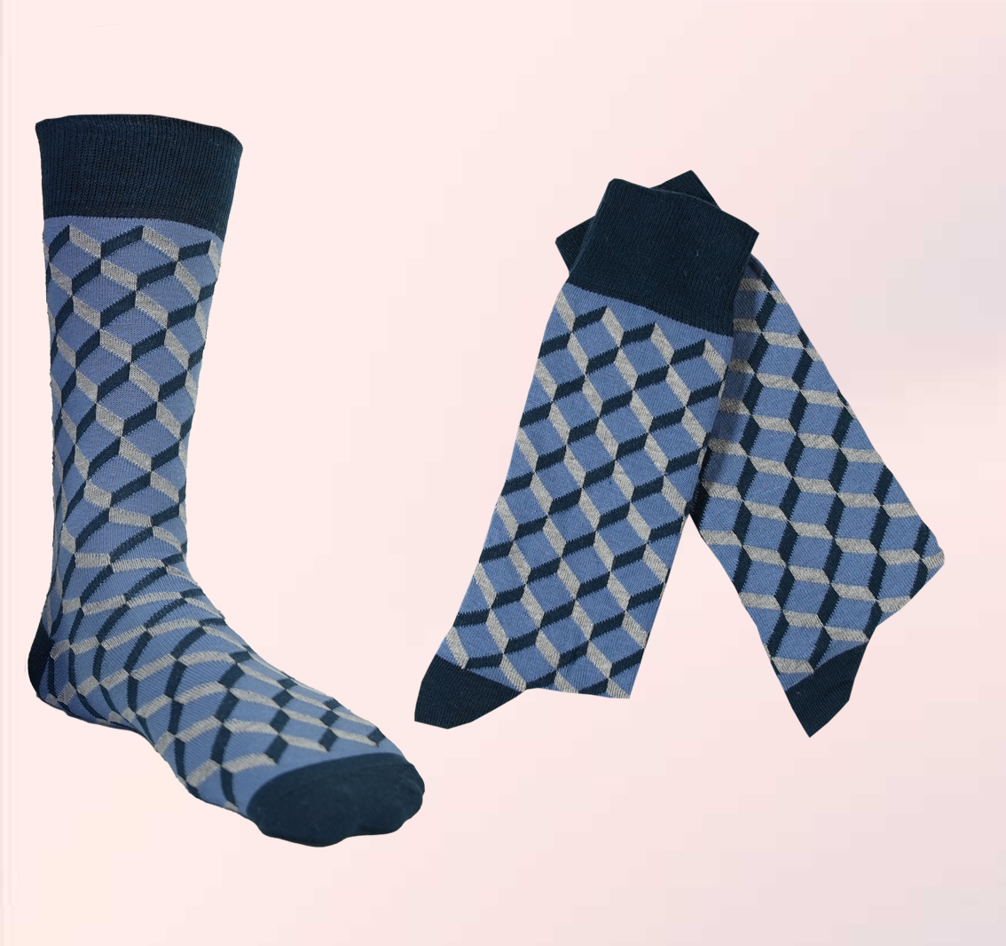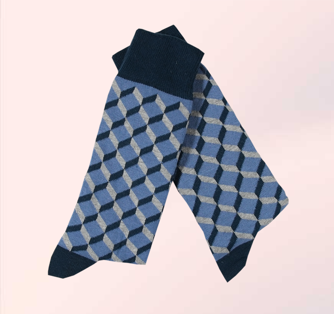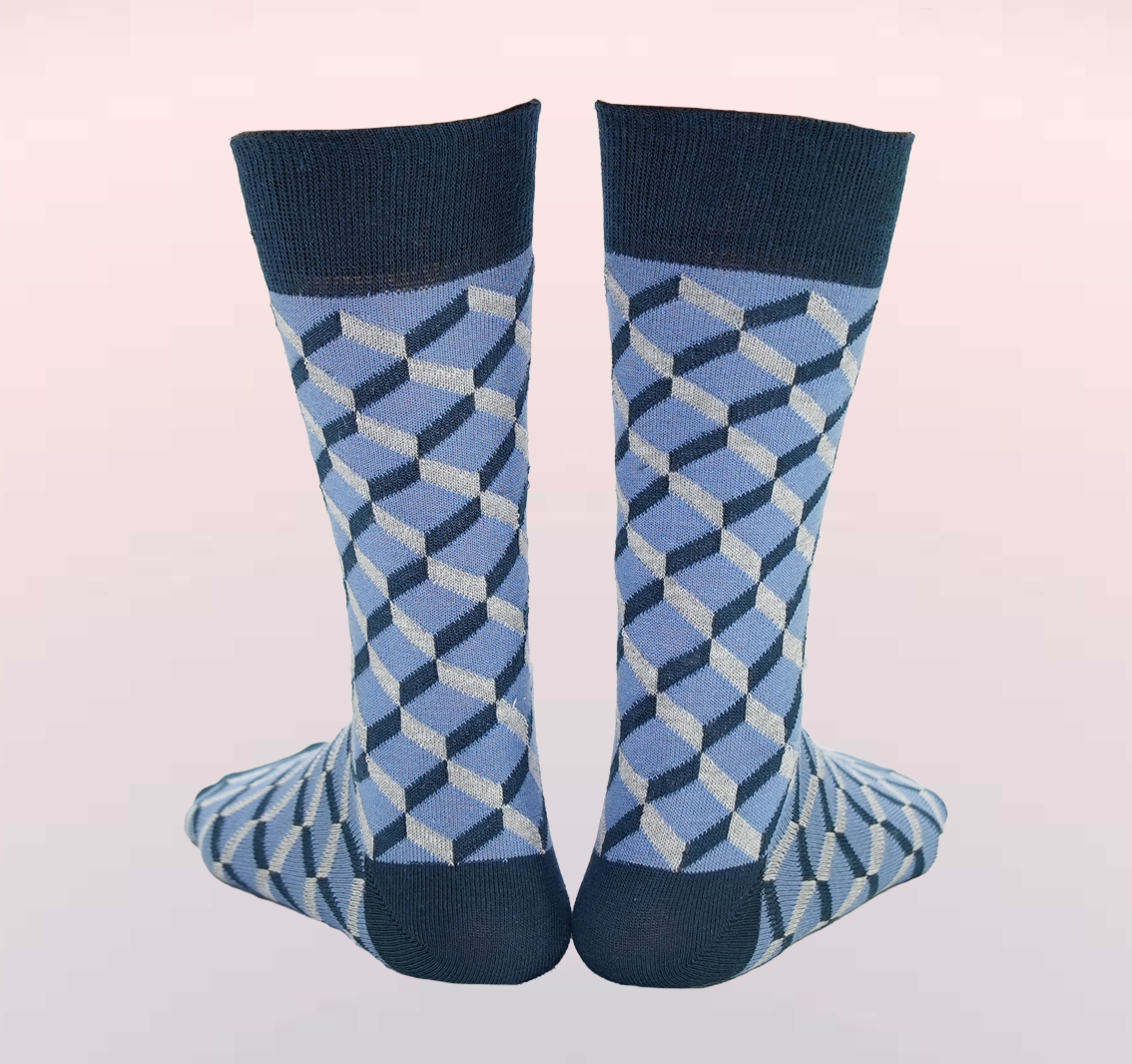 Desen: Çorap üzerinde üç boyutlu küpleri andıran geometrik bir desen var. Bu desen, çoraba optik bir yanılsama etkisi veriyor ve oldukça dikkat çekici. Geometrik desenler, modern ve minimalist tarzlarda sıkça kullanılan popüler bir seçenektir.