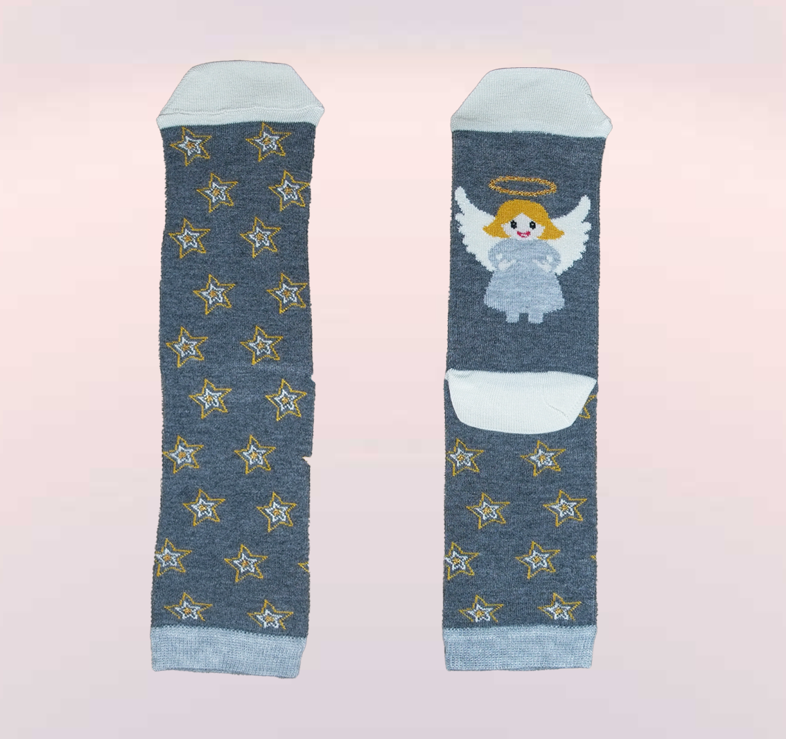 Renkler: Çorap gri renktedir. Üzerinde yıldız seneleri ve altında melek deseni vardır.; Türü: Çorap, soket bir modeldir.; Bu tür çoraplar, günlük kullanım için idealdir.;