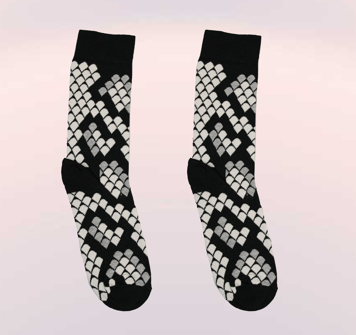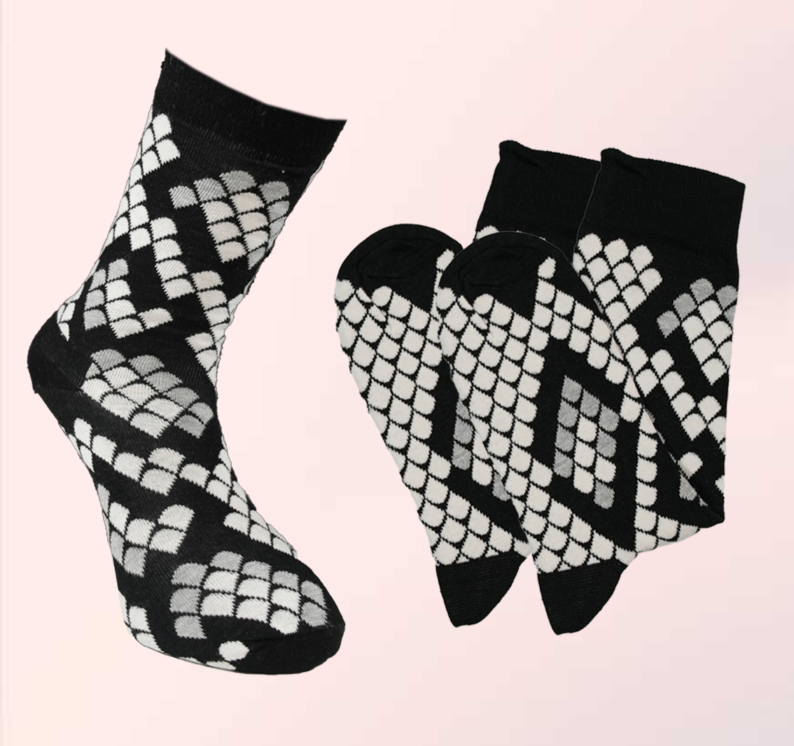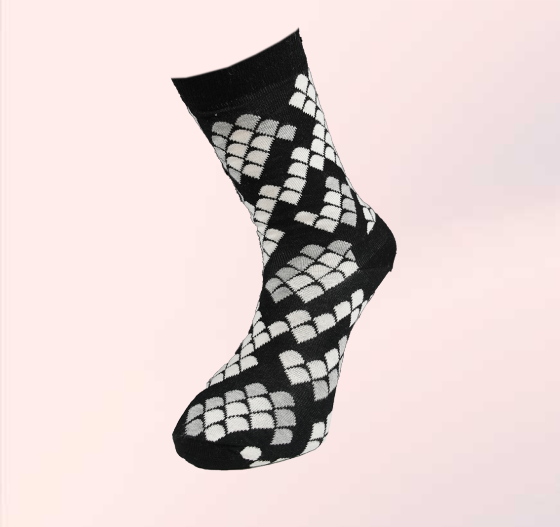 Renkler: Çorap ağırlıklı olarak siyah renkte. Üzerindeki desenler ise beyaz ve gri tonlarında. Bu renk kombinasyonu, çoraba hem şık hem de modern bir hava katmış.